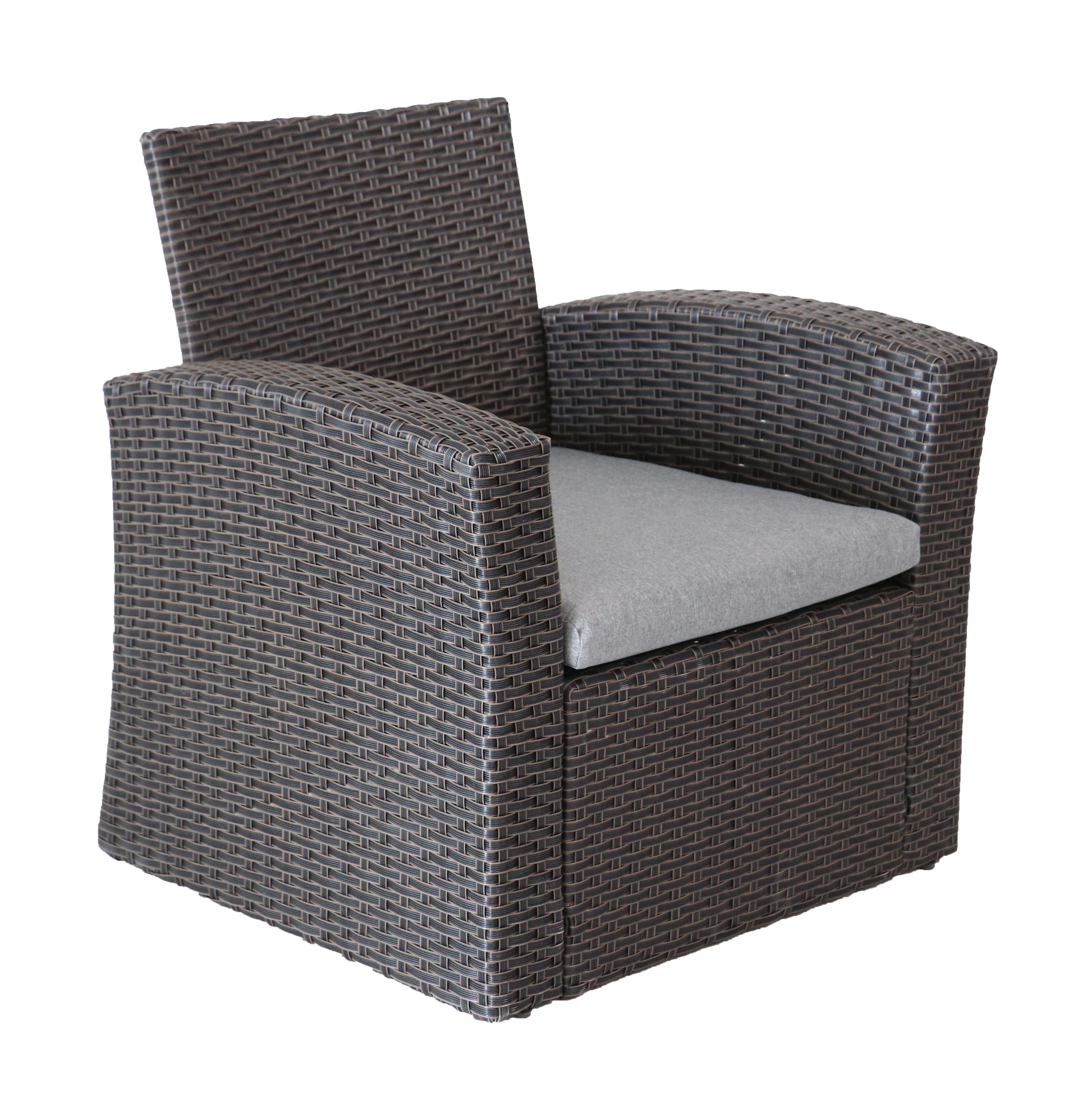 Each piece is wrapped in durable resin wicker for a breezy design. The seat and back cushions are wrapped in polyester and filled with foam for just the right amount of support.