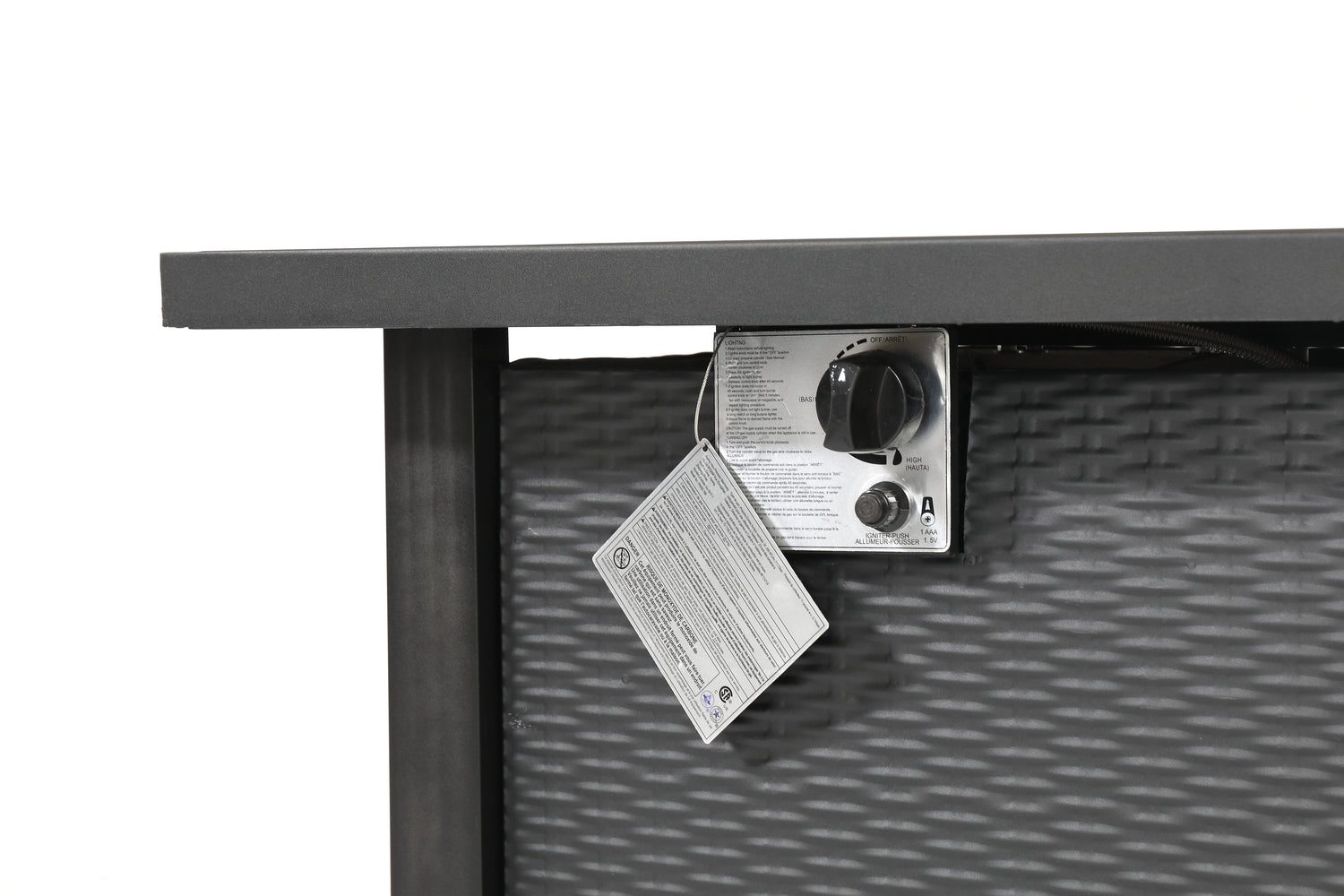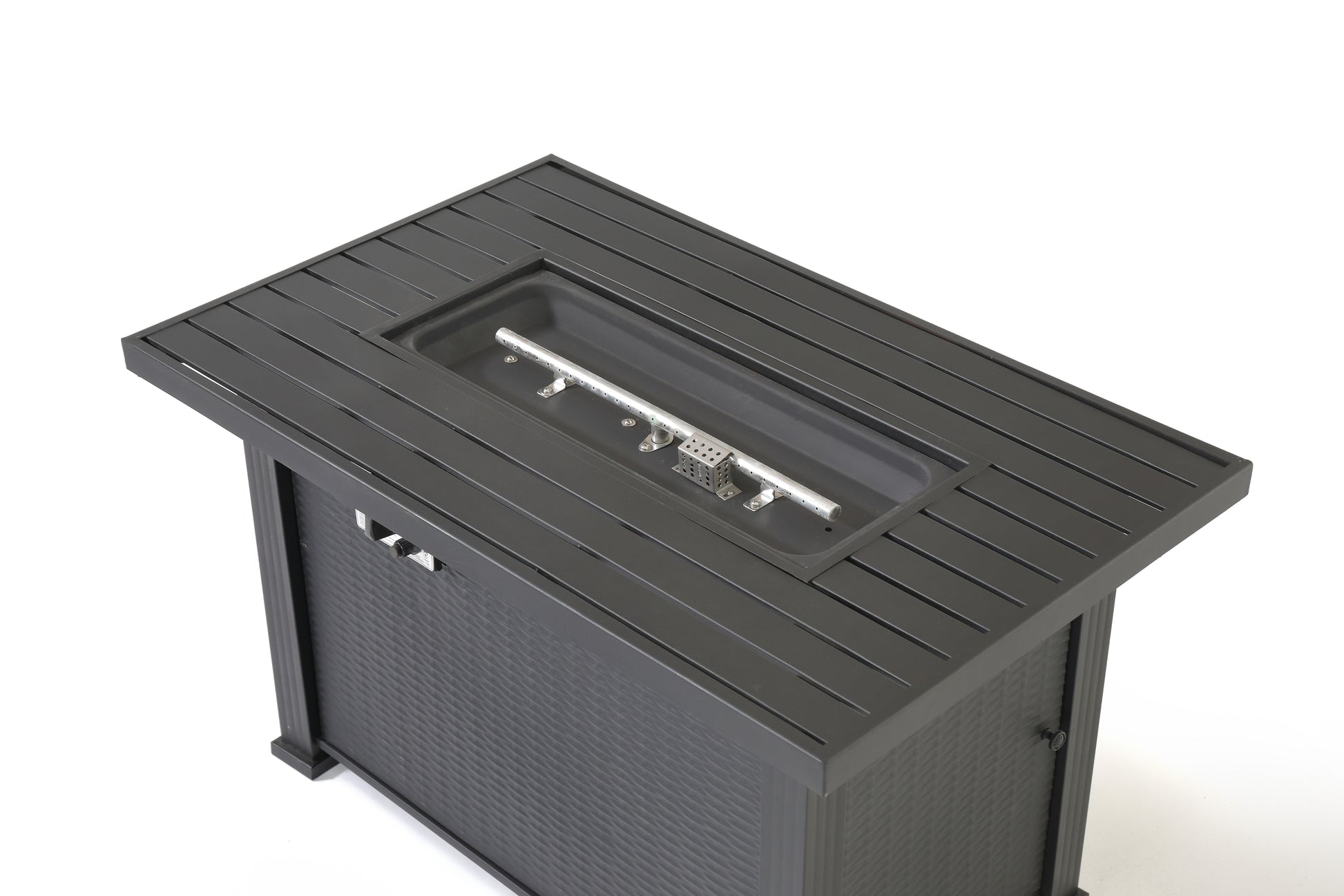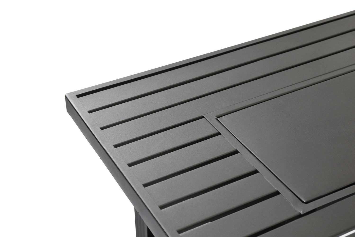 Sleek iron panels with slatted details give the patio fire table a modern finish. Easily convert the fire pit coffee table into a large dining table with the included burner lid.