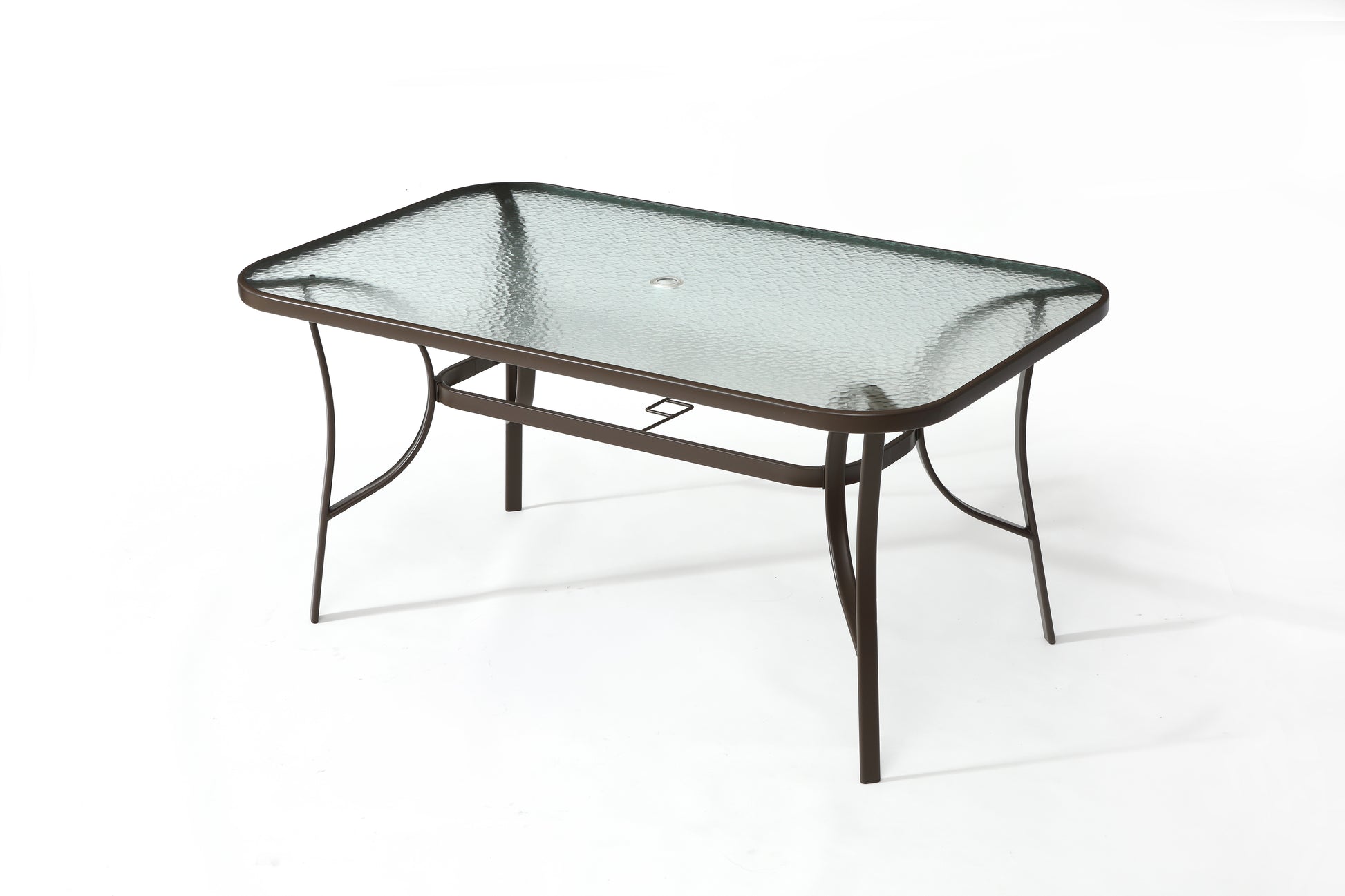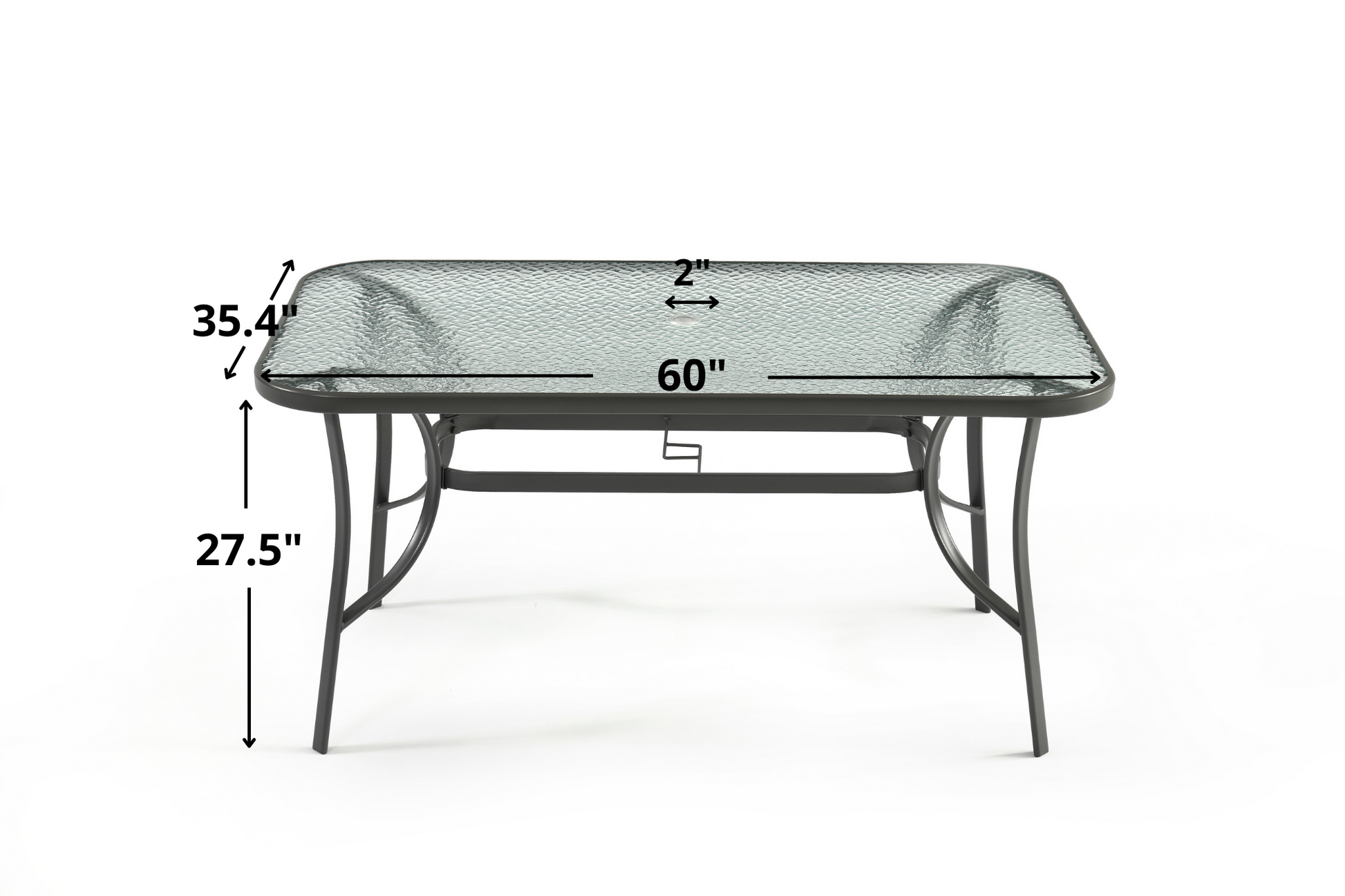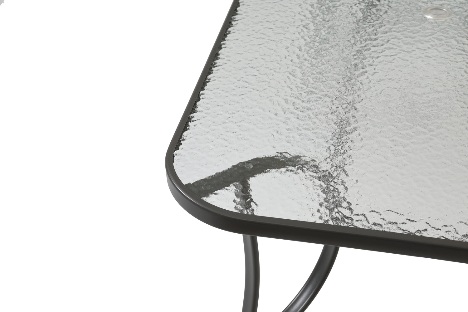 The rectangular surface made from tempered glass and showcases a central hole for mounting a table umbrella of your choice.